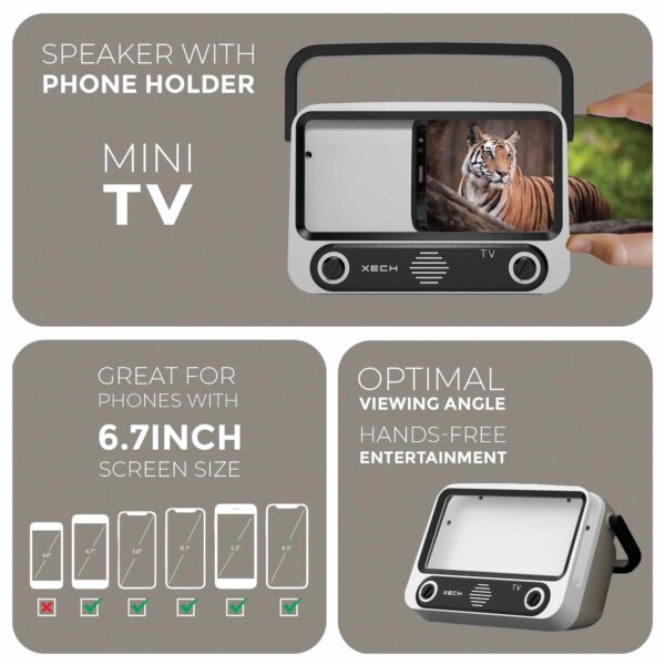 Introducing XECH Tellivibe Max! A 5W Mini Bluetooth Speaker with a Phone Holder to take your hands-free entertainment to the MAX! Simply connect your smartphone and slide it in and enjoy an immersive handsfree viewing experience.